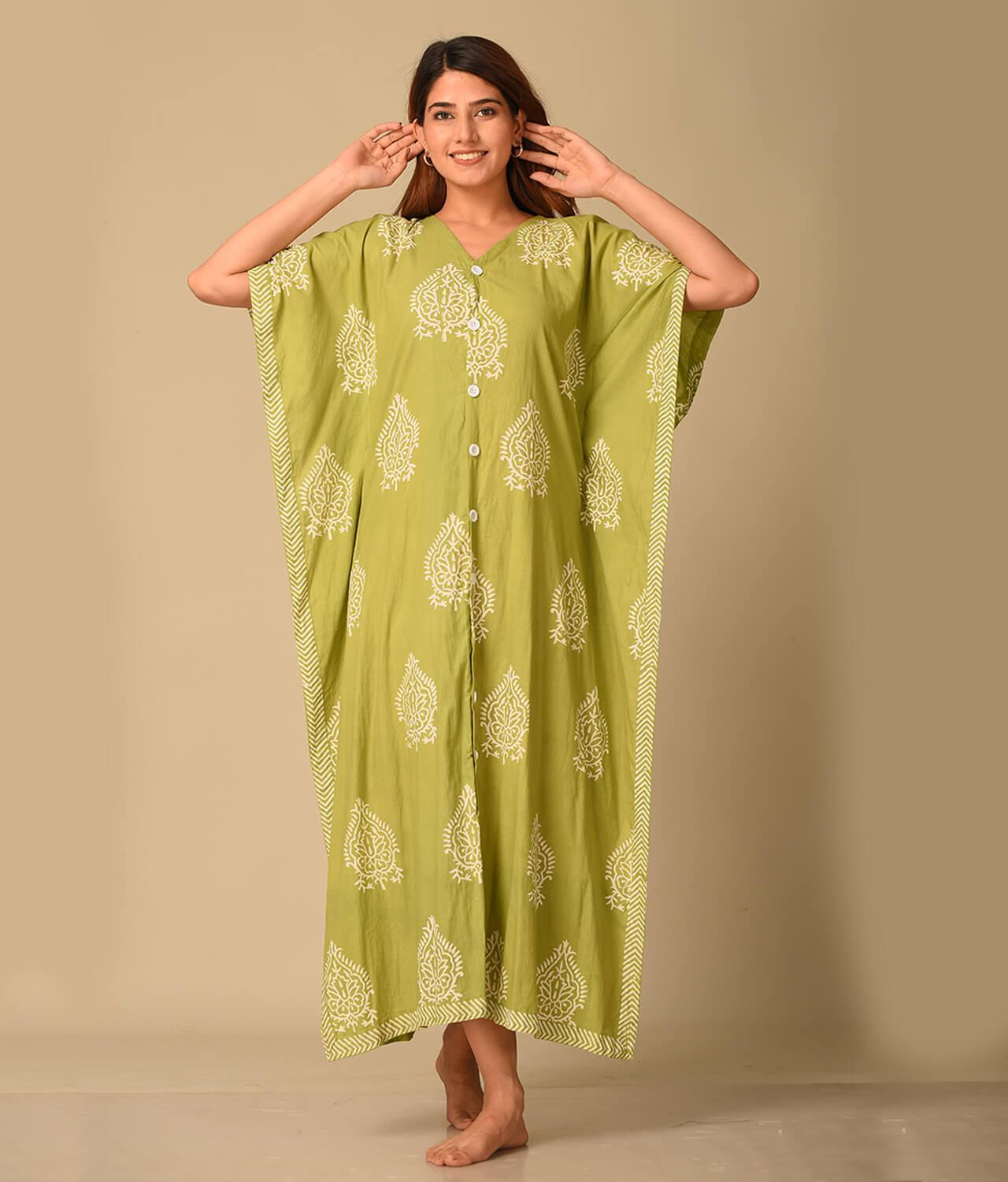 / Green Floral Printed Front Button Cotton Kaftan